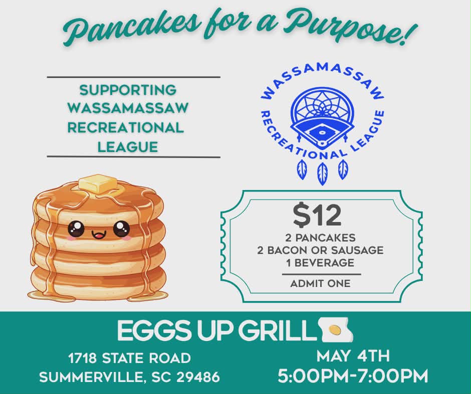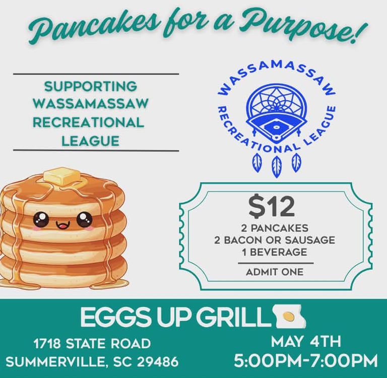 Join us at Eggs Up Grill to raise funds for the Wassamassaw Recreational League. Enjoy a variety of delicious breakfast menu options in a friendly atmosphere, conveniently located for easy access. Perfect for ending your day with a satisfying meal in a welcoming setting.