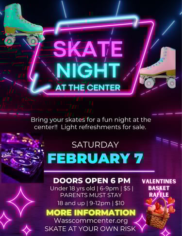 We are hosting a skate night at the center on Saturday February 7th. All welcome to bring your own skates. Youth under 18 are allowed from 6pm to 9pm and a parent must stay with them. NO DROPOFFS! We will then have adults only 18 and up from 9pm to 12am. Admission is $5 from 6-9pm and $10 after 9pm. Food and refreshments will be for sale.